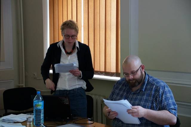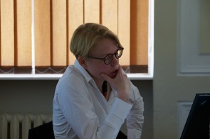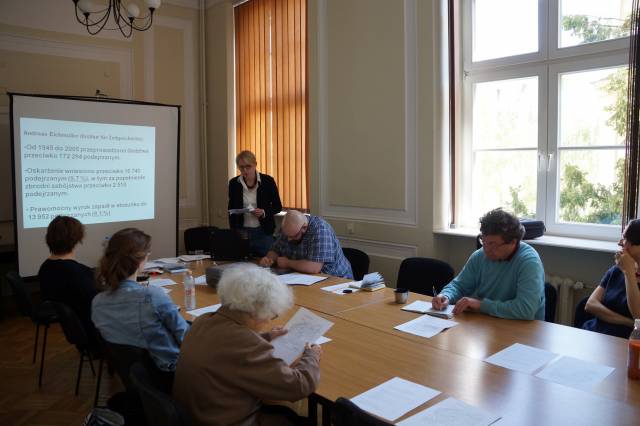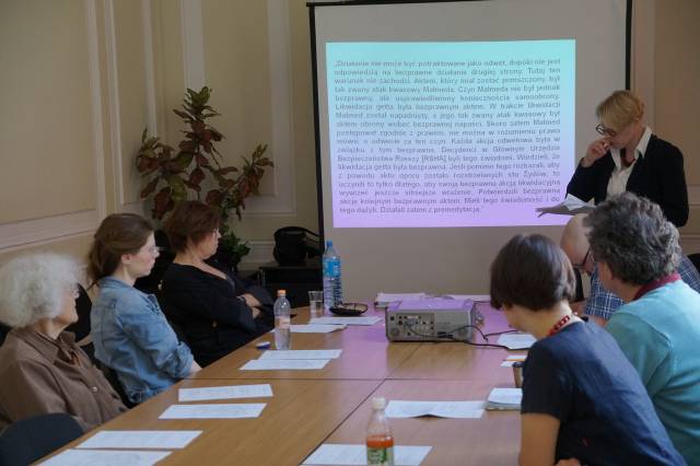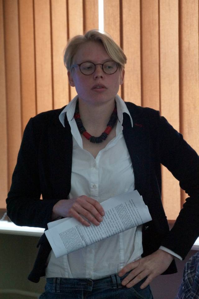 Katrin Stoll przedstawiła proces w Bielefeld jako wyprzedzający swój czas i bardzo ważny dla formowania się i pogłębiania świadomości Niemców dotyczącej niemieckiej odpowiedzialności za Zagładę Żydów. Z drugiej jednak strony referentka wskazywała też na typowe dla tamtego czasu kłopoty, jakie fakt rozmiarów i zasięgu tej odpowiedzialności miał jednak z przebiciem się do świadomości Niemców. Wyjątkowość procesu polegała na tym, że sędziowie wzięli pod uwagę liczne dokumenty dotyczące deportacji Żydów z okręgu białostockiego. Dokumenty te udało im się uzyskać dzięki prowadzonym z własnej inicjatywy poszukiwaniom prowadzonym w europejskich i izraelskich archiwach. Wynikiem uwzględnienia tej dokumentacji było między innymi wykazanie, że oskarżeni – wbrew swoim deklaracjom – znali cel przygotowywanych przez siebie transportów żydowskiej ludności. Ponieważ część z nich jechała do obozu zagłady w Treblince, stanowiło to w oczach sądu wyraźną poszlakę wskazującą, że oskarżenie mogli wiedzieć, że wysyłani przez nich ludzie jechali na pewną śmierć. Katrin Stoll wskazywała jednak równocześnie, że proces toczył się w czasach, w których społeczeństwo Niemieckie nie było jeszcze w stanie przyjąć do wiadomości, jak wielu Niemców ponosiło odpowiedzialność za Zagładę Żydów. Znalazło to odzwierciedlenie w sposobie w jaki przebiegał proces. Przede wszystkim oskarżenie zmierzało do uznania oskarżonych za współpracowników, a nie za sprawców zbrodni, jaką była eksterminacja białostockich Żydów. Takie spojrzenie było wynikiem rozpowszechnionego wówczas w Niemczech myślenia, zgodnie z którym Zagłada była zbrodnią państwa niemieckiego popełnioną przez tak zwanych głównych sprawców. Sprowadzało się to w praktyce do traktowania Zagłady jako działania scentralizowanego, za które pełną odpowiedzialność ponosiła nieliczna grupa ludzi. W wyniku takiego sposobu myślenia oskarżeni, chociaż uznani zostali za winnych, uniknęli najpoważniejszych kar i żaden z nich nie został skazany na więcej niż 10 lat więzienia. Katrin Stoll nie miała wątpliwości, że w świetle dzisiejszej wiedzy na temat Zagłady, nie była ona działaniem zcentralizowanym, lecz miała wielu sprawców. Zdaniem referentki również oskarżeni w procesie w Bielefeld powinni zostać zaliczeni do sprawców dokonanej zbrodni, nie zaś jedynie współpracowników. Po referacie doszło do dyskusji. W jej trakcie padały między innymi szczegółowe pytania dotyczące interpretacji dokumentów analizowanych w trakcie procesu. Padło również pytanie o sposób w jaki traktowane były w trakcie procesu wypowiedzi Żydowskich świadków oskarżenia. Katrin Stoll zwróciła uwagę na swoistą ambiwalencję w stosunku sądu do tych zeznań. Z jednej bowiem strony często proszono zeznających Żydów o unikanie emocjonalności i całkowity obiektywizm, z drugiej zaś strony pozwalano im opowiadać o swoich doświadczeniach Zagłady, nie zawsze mających bezpośrednie znaczenia dla sprawy. Jeden z uczestników seminarium postawił w trakcie dyskusji tezę, że procesy podobne do tego w Bielefeld nie mogły zagwarantować nawet namiastki sprawiedliwości. Głos ten spotkał się ze sprzeciwem ze strony wielu uczestników seminarium,. Profesor Barbara Engelking twierdziła, że tego typu procesy – chociaż mogą rodzić uczucie rozczarowania – są jedynym możliwym i koniecznym jednocześnie sposobem dochodzenia sprawiedliwości w wypadku zbrodni wojennych. Doktor Monika Polit zwróciła również uwagę, że proces w Bilefeld jawi się w znacznie lepszym świetle, jeżeli spojrzy się na niego jako na część ogromnego wysiłku Niemców zmierzającego do przebudowy własnej świadomości dotyczącej odpowiedzialności za Zagładę dr Katrin Stoll – - historyczka, anglistka, absolwentka Uniwersytetu w Bielefeldzie. Autorka monografii zatytułowanej Die Herstellung der Wahrheit. Strafverfahren gegen ehemalige Angehörige der Sicherheitspolizei für den Bezirk Bialystok, Berlin 2012. W latach 2009-2013 visiting scholar w Niemieckim Instytucie Historycznym w Warszawie; od 2013 wykładowca w Department of English Language Cultural and Literary Studies, Institute of English Studies, SWPS w Warszawie. Zainteresowanie badawcze: historiografia Holocaustu, narracja o przeszłości nazistowskiej w Niemczech, postępowanie karne przeciwko zbrodniarzom nazistowskim w Republice Federalnej, teoria historii, literatura amerykańska.