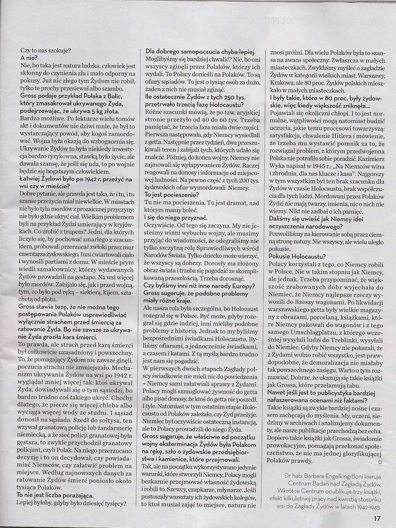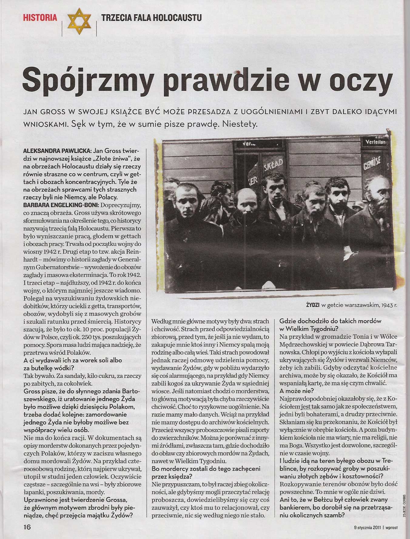 Pierwszy tegoroczny numer tygodnia Wprost przynosi wywiad z Barbarą Engelking-Boni na temat mającej się ukazać w lutym nakładem Wydawncitwa Znak najnowszej książki Jana Tomasza Grossa pt. Złote żniwa