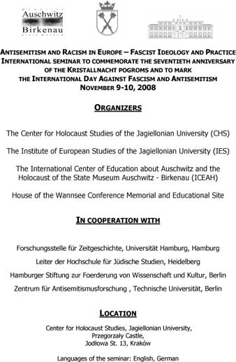 W dniach 9-10 listopada 2008 - Centrum Badań Holokaustu UJ oraz współorganizatorzy zapraszaja na Międzynarodowe seminarium pt. ANTISEMITISM AND RACISM IN EUROPE – FASCIST IDEOLOGY AND PRACTICE