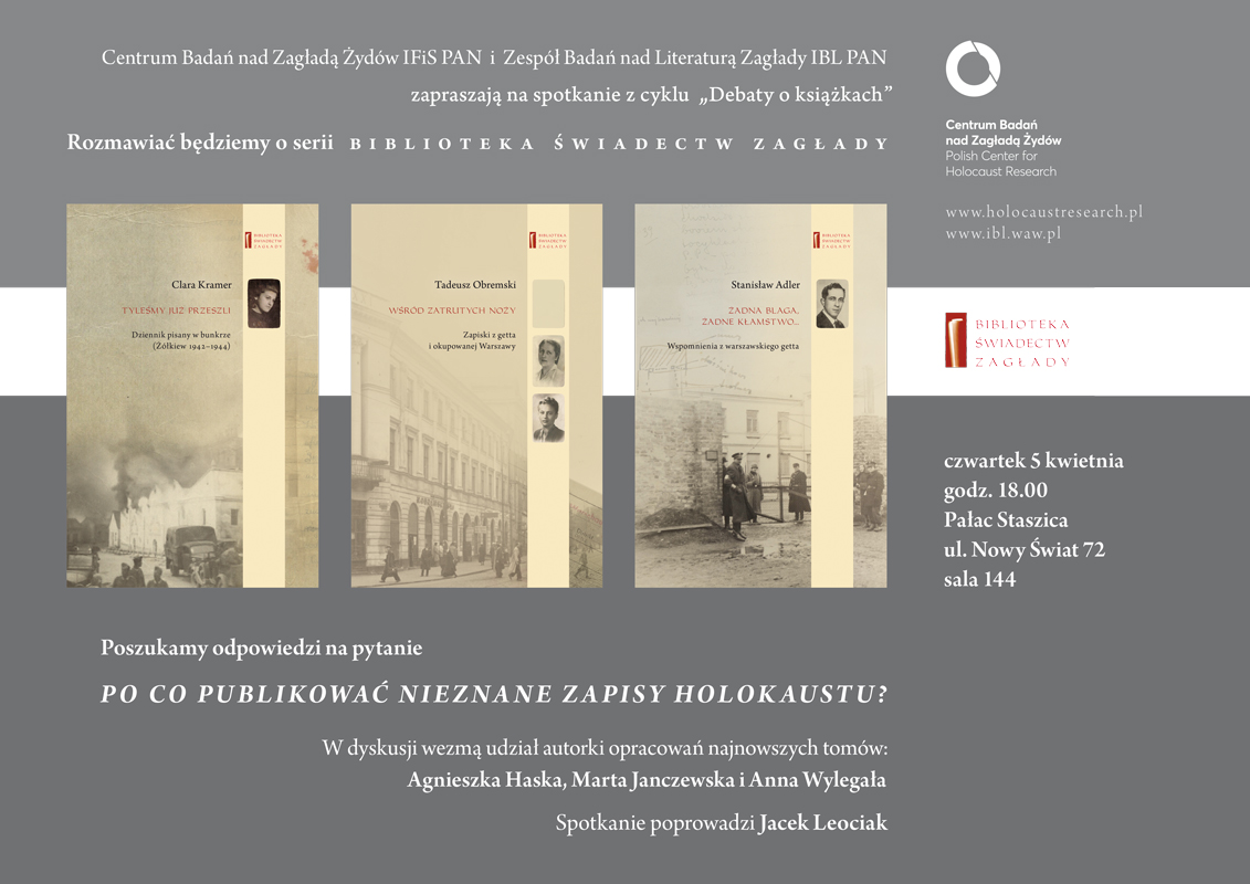 Centrum Badań nad Zagłądą Żydów IFiS PAN wspólnie z Zespołem Badań nad Literaturą Zagłądy IBL PAN zaprasza na prezentację najnowszych książek z serii "Bibliotek Świadectw Zagłady" oraz do rozmowy o potrzebie, sensie i znaczeniu edycji nieznanych zapisów Holokaustu. Spojrzymy na warszawskie getto i 'stronę aryjską' z perspektywy dorosłych, a także Żółkiew i ukrywanie w bunkrze widziane oczami dziecka.