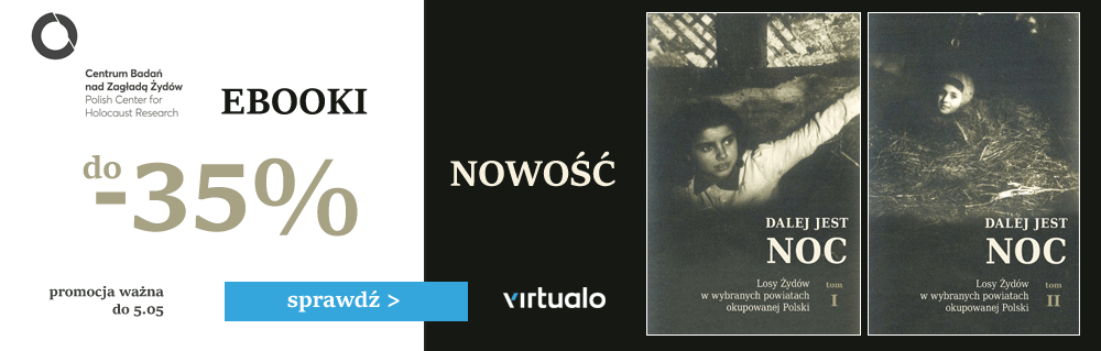 Mamy dobrą wiadomość dla wszystkich niecierpliwie oczekujących wersji elektronicznej. Już dziś trafia na naszą "wirtualną półkę" zapowiadany eBook książki "Dalej jest noc. Losy Żydów w wybranych powiatach okupowanej Polski". Z okazji premiery wspólnie z Virtualo przygotowaliśmy specjalny rabat zarówno na te książkę, jak i inne publikacje Centrum.