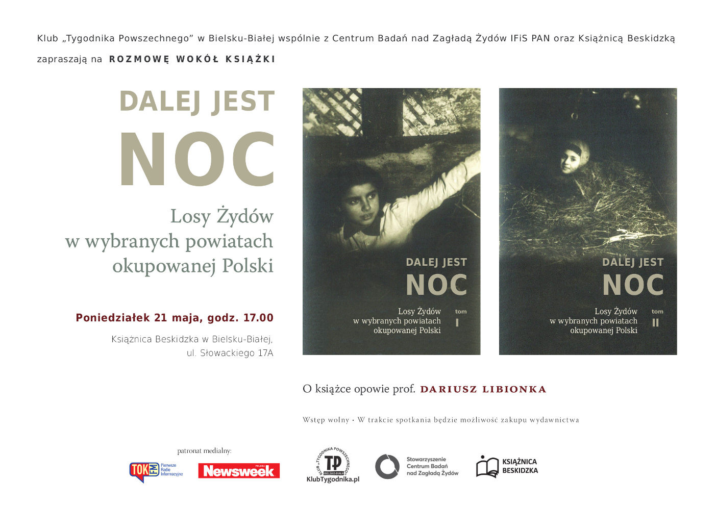 21 maja o godz. 17.00 zapraszamy wspólnie z Klubem "Tygodnika Powszechnego" w Bielsku Białej i Książnicą Beskidzką na spotkanie z prof. Dariuszem Libionką wokół książki "Dalej jest noc. Losy Żydów w wybranych powiatach okupowanej Polski"