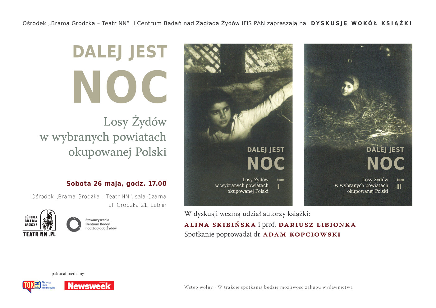 Zapraszamy do Lublina. 26 maja o godz. 17.00 w Ośrodku "Brama Grodzka - Teatr NN" o książce "Dalej jest noc. Losy Żydów w wybranych powiatach okupowanej Polski" opowiadać będą Dariusz Libionka i Alina Skibińska
