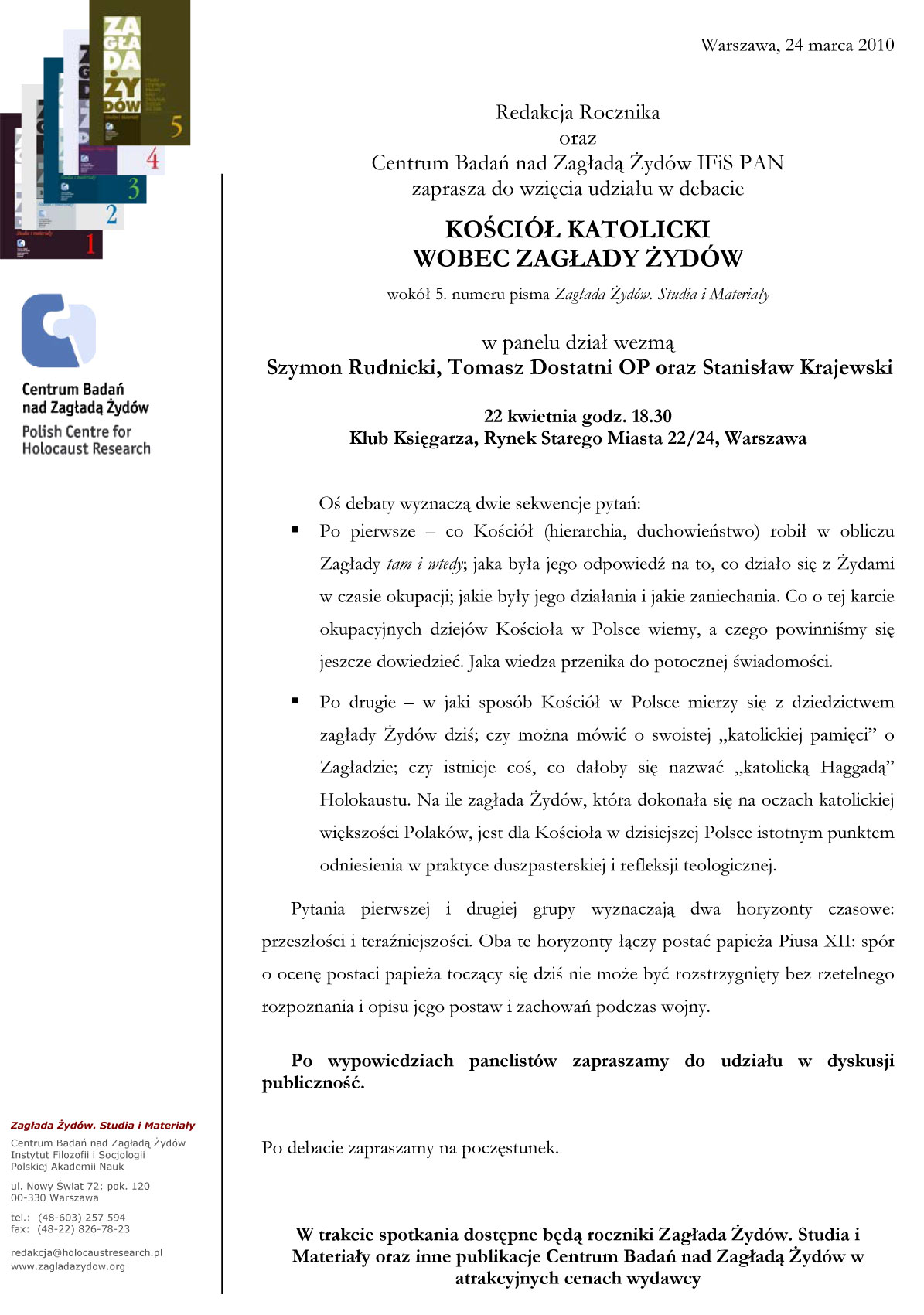 Redakcja rocznika Zagłada Żydów. Studia i Materiały zaprasza 22 kwietnia 2010 o godz. 18.30 na debatę pt. Kościół Katolicki wobec Zagłady Żydów wokół 5 numeru rocznika.