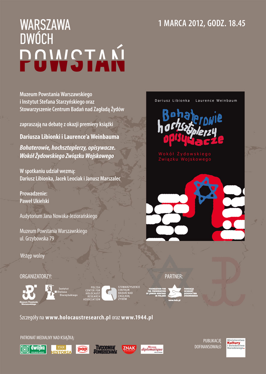 Zapraszamy współnie z Muzeum Powstania Warszawskieg i Instytutem Starzyńskiego na debatę i prezentację wokół książki Dariusza Libionki i Laurence'a Weinbauma, Bohaterowie, hochsztaplerzy, opisywacze. Wokół Żydowskiego Związku Wojskowego.
