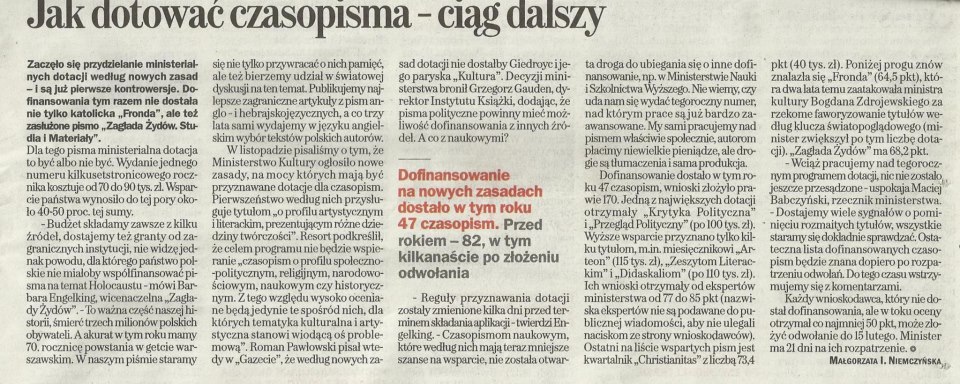 Decyzja podjęta przez Ministra Kultury i Dziedzictwa Narodowego praktycznie uniemożliwia w roku 2013 wydanie kolejnego numeru w języku polskim oraz wyboru tekstów w języku angielskim, nad którymi prace są już bardzo zaawansowane. Redakcja, która pozyskała już znaczącą część budżetu na obie edycje, nie ma praktycznie w bieżącym roku możliwości pozyskania środków brakujących na skutek decyzji MKiDN.