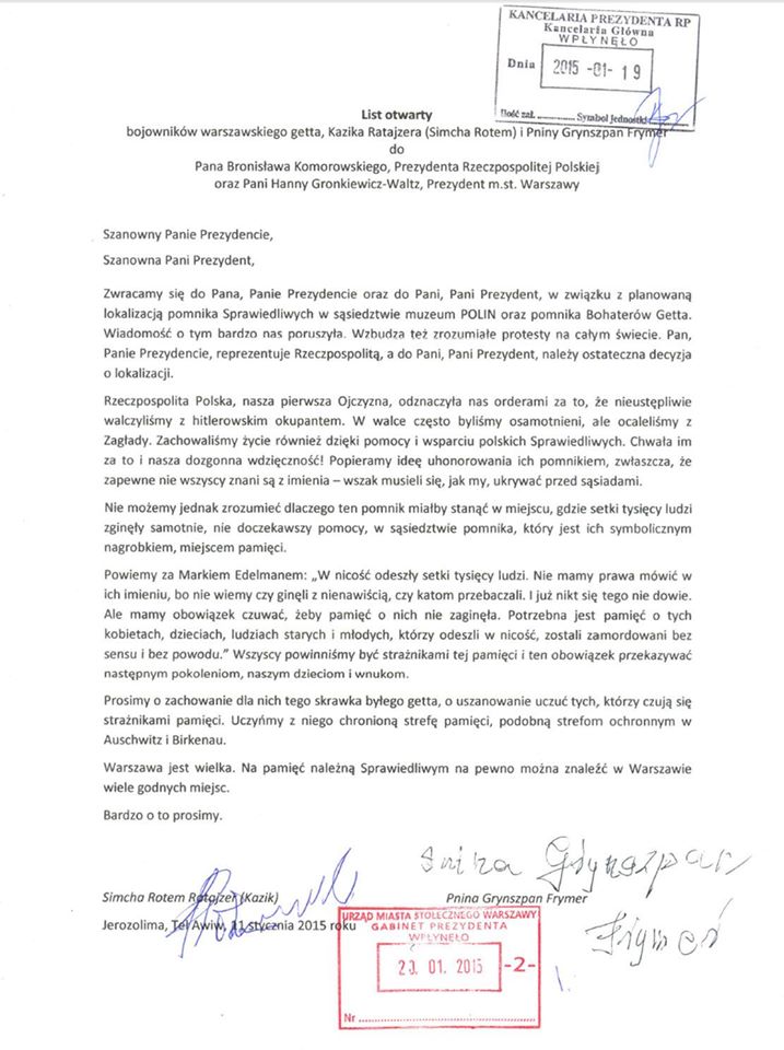 List Otwarty Bojownikow Warszawskiego Ghetta Kazika Ratajzera (Simcha Rotem) i Pniny Grynszpan Frymer do Prezydenta Polski w sprawie lokalizacji pomnika Sprawiedliwych przy pomniku Bohaterów Getta
