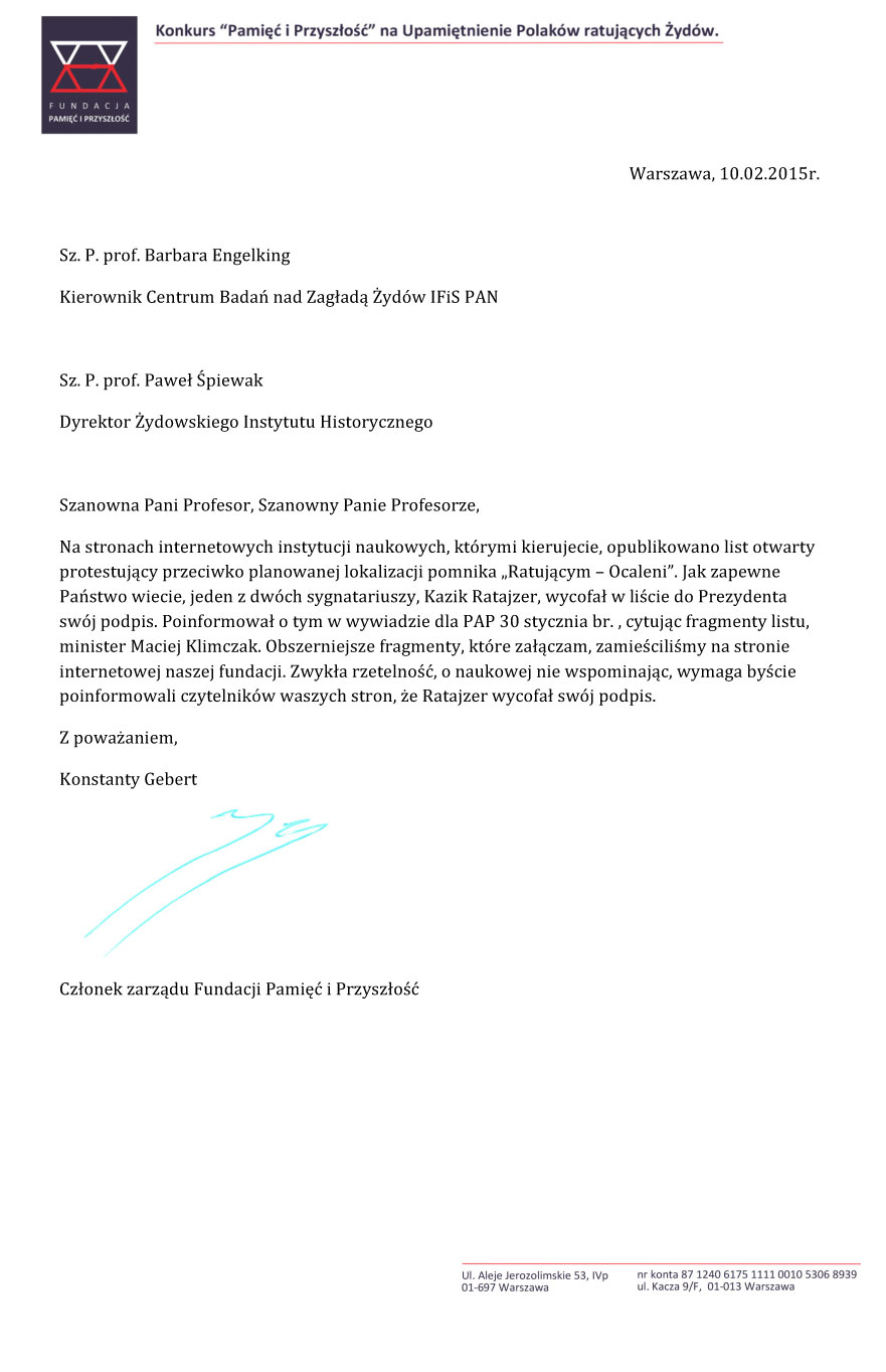Tu zgadzamy się z Konstantym Gebertem - powinniśmy. Jak wskazuje autor pisma, kierowani „zwykłą rzetelnością”, a także rzetelnością naukową chcieliśmy go opublikować. Niestety nie mamy takiej możliwości, nie udało się nam bowiem uzyskać dostępu do listu K. Ratajzera wycofującego swój sprzeciw. Także fundacja Pamięć i Przyszłość reprezentowana przez K. Geberta odmówiła nam, informując, że nie posiada całości listu, a jedynie jego fragmenty.