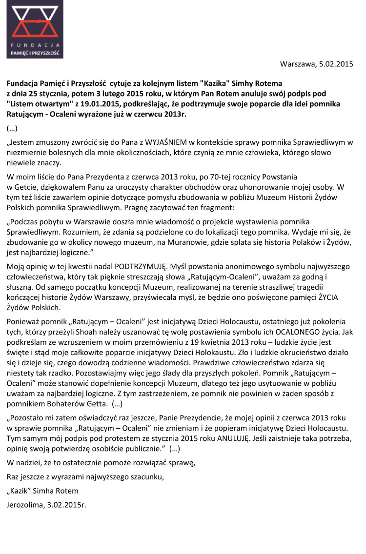 W reakcji na publikację listu otwartego Bojownikow Warszawskiego Ghetta Kazika Ratajzera (Simcha Rotem) i Pniny Grynszpan Frymer do Prezydenta Polski w sprawie lokalizacji pomnika Sprawiedliwych przy pomniku Bohaterów Getta kancelaria Prezydenta ogłosiła wycofanie się K. Ratajzera ze swojego pierwotnego stanowiska. Niestety nie udało się nam uzyskać dostępu do pełnej treśc listu, publikujemy więc wyimki tegoż przesłane przez Fundację Pamięć i Przyszłość – która kieruje pracami związanymi z erygowaniem pomnika „Ratującym-Ocaleni”.