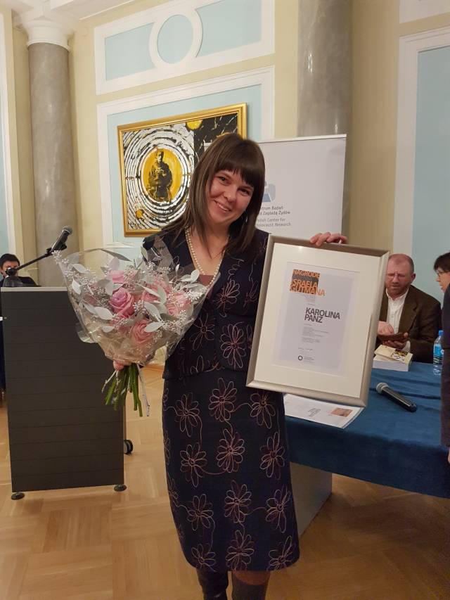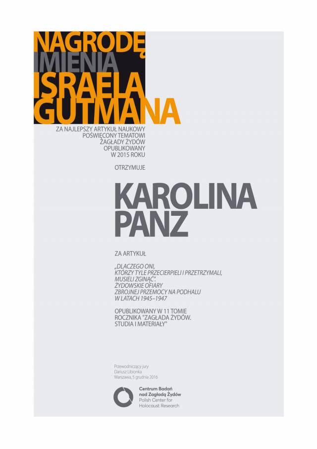 Karolina Panz od kilku lat mieszka wraz z rodziną w Rabie Wyżnej na Podhalu, gdzie kontynuuje pracę badawczą i zajmuje się działalnością społeczną. Przygotowuje rozprawę doktorską zatyułowaną „Zagłada żydowskich mieszkańców Nowego Targu w perspektywie mikrohistorycznej – głosy, obrazy, przybliżenia i oddalenia”, pisaną pod opieką naukową profesor Małgorzaty Melchior. Opublikowała już na ten temat kilka artykułów. Jeden z nich zdecydowaliśmy się uhonorować nagrodą Israela Gutmana.