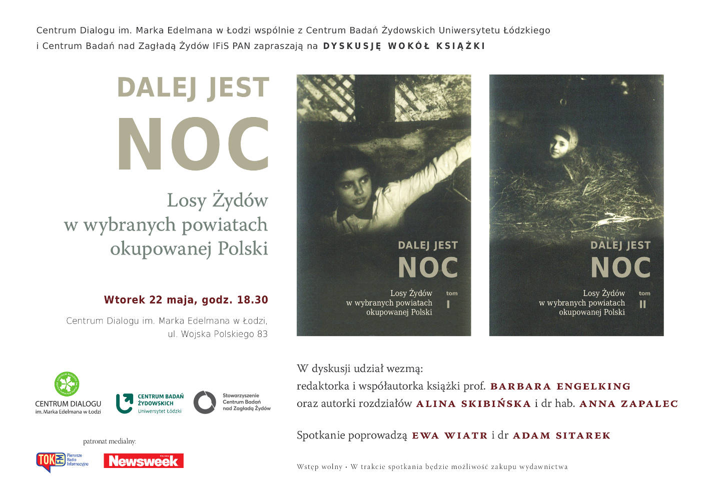 22 maja o godz. 18.30 zapraszamy wspólnie z Centrum Dialogu im. Marka Edelmana w Łodzi oraz Centrum Badań Żydowskich Uniwersytetu Łódzkiego na spotkanie z prof. Barbarą Engelking, Aliną Skibińską i dr hab. Anną Żapalec wokół książki "Dalej jest noc. Losy Żydów w wybranych powiatach okupowanej Polski"