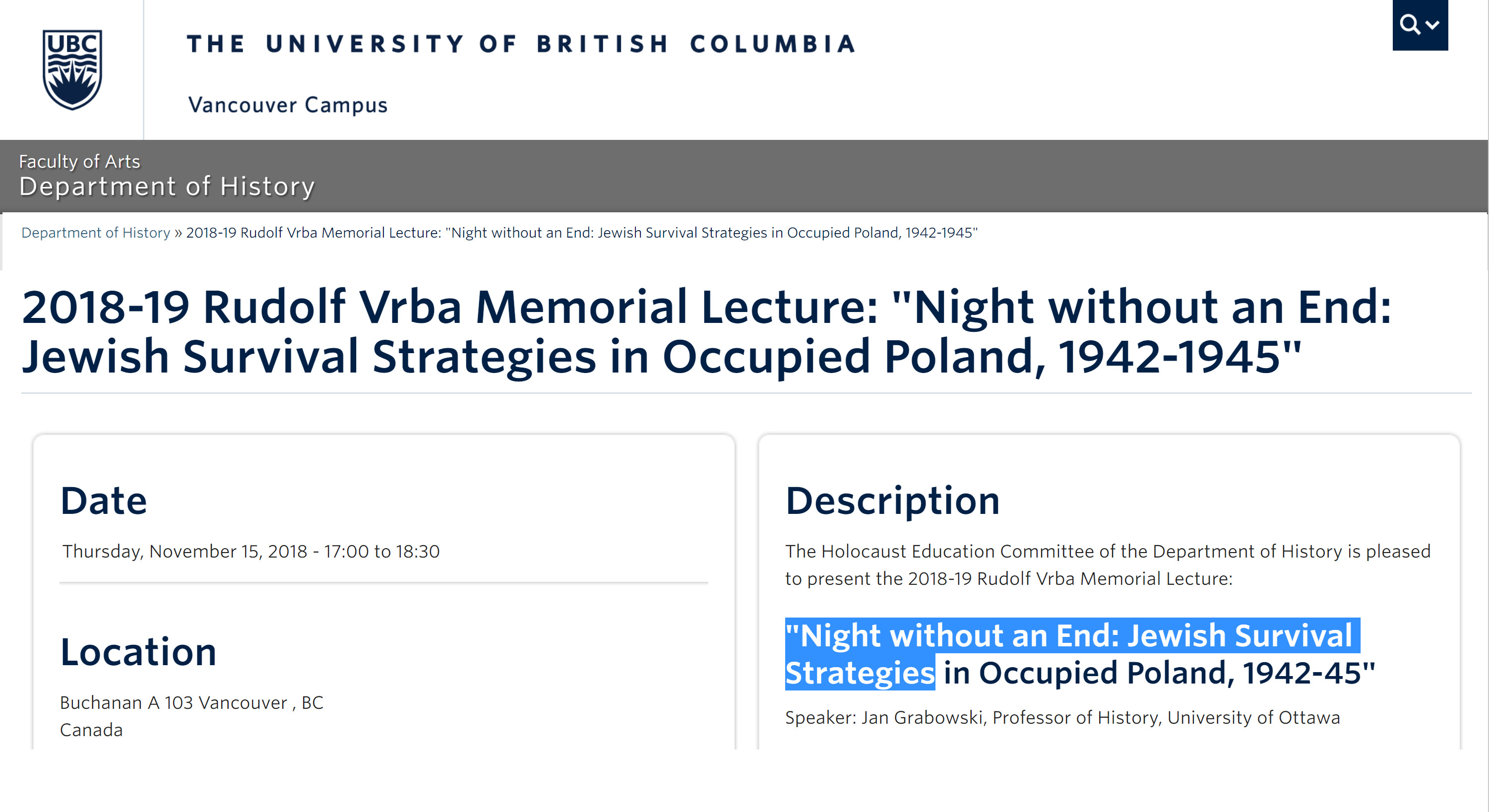 The Holocaust Education Committee of the Department of History at University of Brotish Columbia is pleased to present the 2018-19 Rudolf Vrba Memorial Lecture "Night without an End: Jewish Survival Strategies in Occupied Poland, 1942-45" The Rudolf Vrba Memorial Lecture honours the memory of Dr. Rudolf Vrba, who was a distinguished medical researcher and professor of pharmacology at UBC for many decades before his death in 2006. Rudolf Vrba also played a critical role in the history of the Holocaust as one of only five Jewish prisoners who ever escaped from Auschwitz. The report written by Rudolf Vrba and his fellow-prisoner Alfred Wetzler following their escape in 1944 was the first eyewitness report about what was happening inside Auschwitz. It is considered a foundational document for understanding the facts about the Holocaust. Book "Night Without an End. The fate of Jews in selected counties of occupied Poland" eddited by prof. Barbara Engelking and prof. Jan Grabowski is a product of several years of work of researchers working in the Polish Centre for Holocaust Research of the Institute of Philosophy and Sociology of the Polish Academy of Sciences.