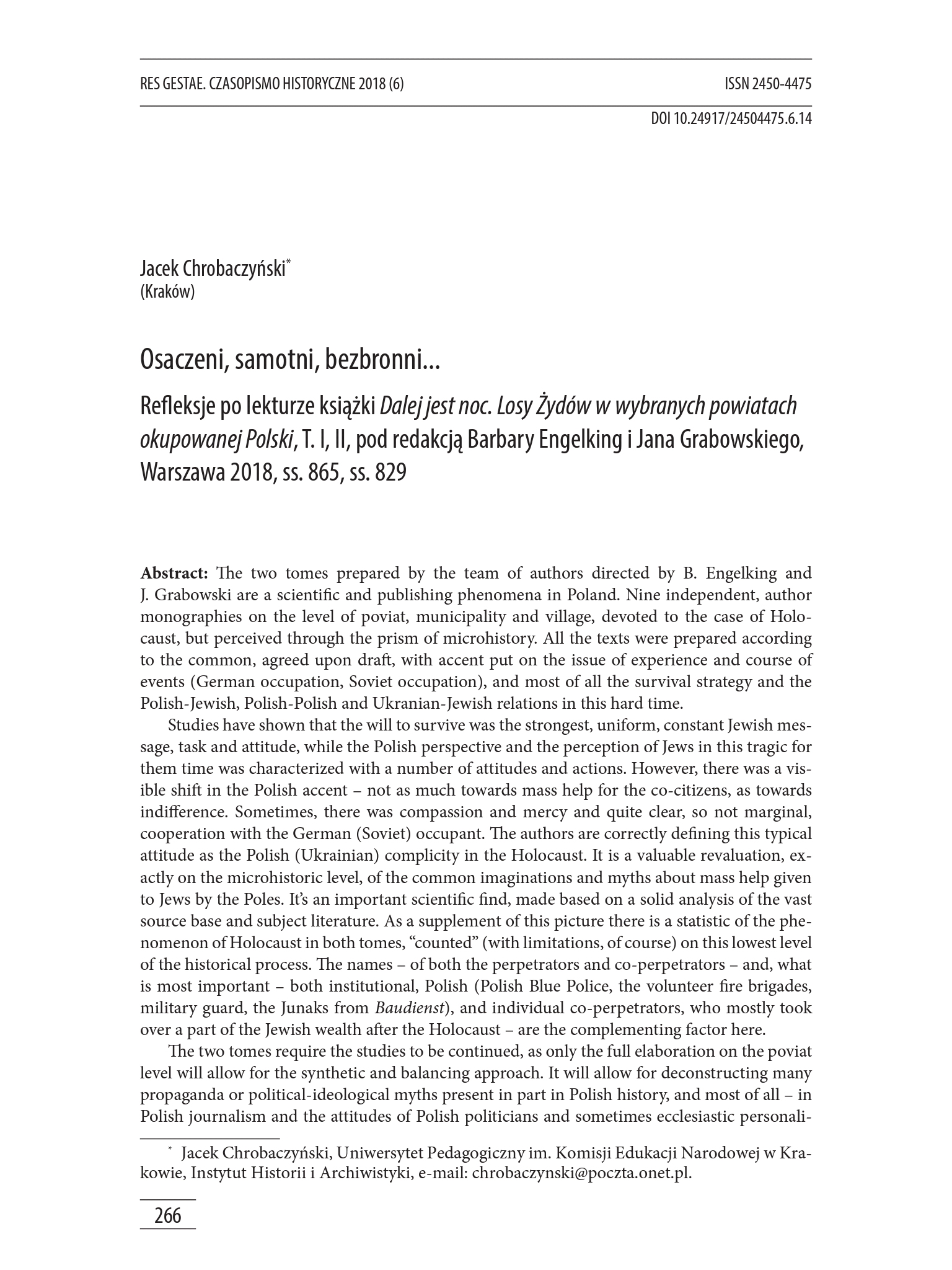 Osaczeni, samotni, bezbronni... Refleksje po lekturze książki Dalej jest noc. Losy Żydów w wybranych powiatach okupowanej Polski, T. I, II, pod redakcją Barbary Engelking i Jana Grabowskiego, Warszawa 2018 Jacek Chrobaczyński