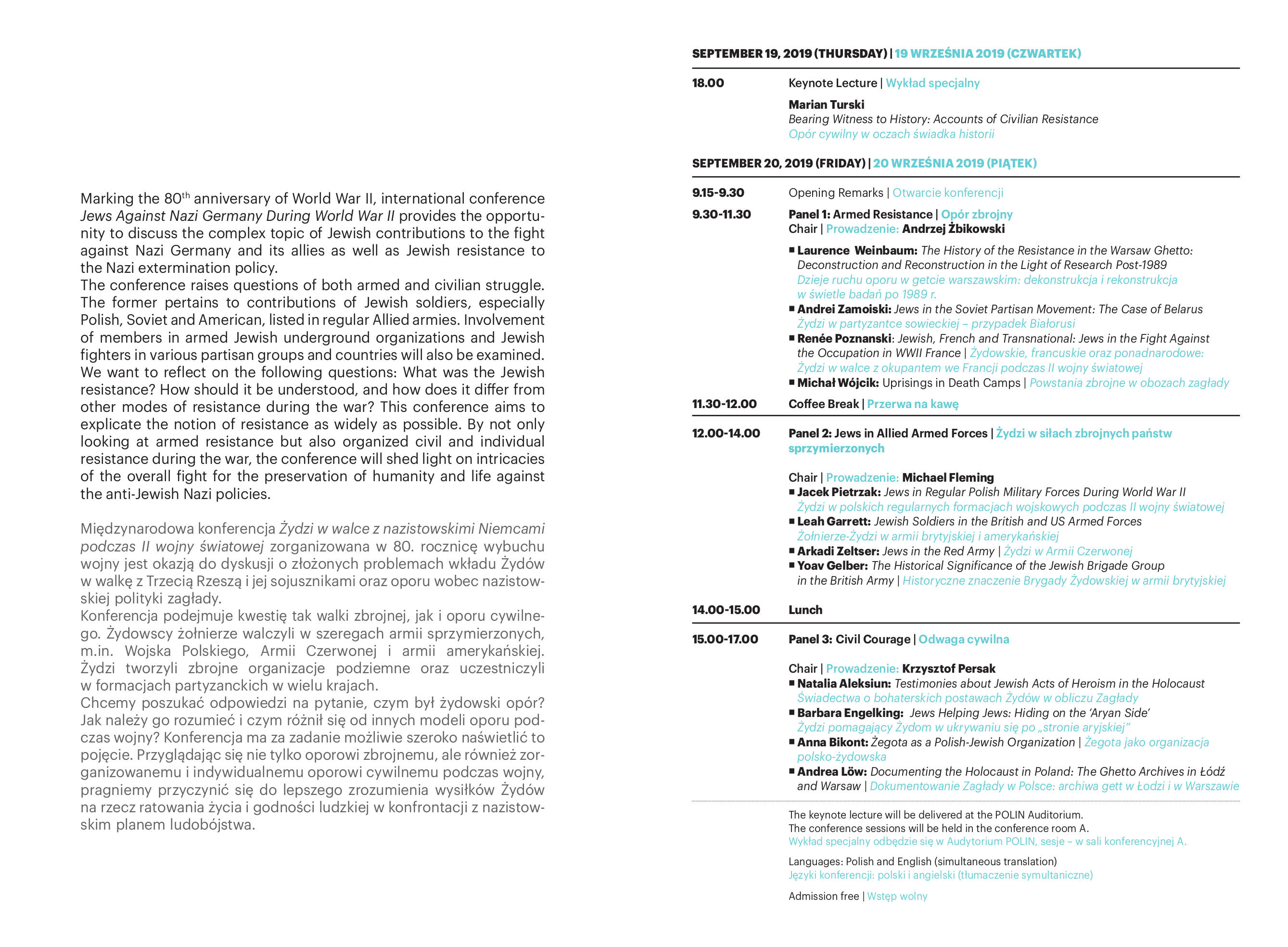 Dzięki inicjatywie Muzeum Historii Żydów Polskich POLIN wspólnie z Żydowskim Instytutem Historycznym oraz Institut für Zeitgeschichte mamy zaszczyt być współorganizatorem konferencji "Żydzi w walce z nazistowskimi Niemcami podczas II wojny Światowej". Serdecznie zapraszamy do Muzeum POLIN w dniach 19-20 września.