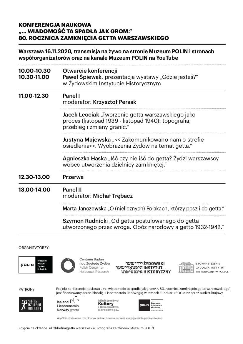 Zapraszamy do transmisji live konferencji naukowej pn. »... wiadomość ta spadła jak grom" w 80. rocznicę zamknięcia getta warszawskiego oganizowanej wspólnie z Muzeum Historii Żydów Polskich POLIN oraz Żydowskim Instytutem Historycznym - START16 listopada (poniedziałek) o godz. 10.00