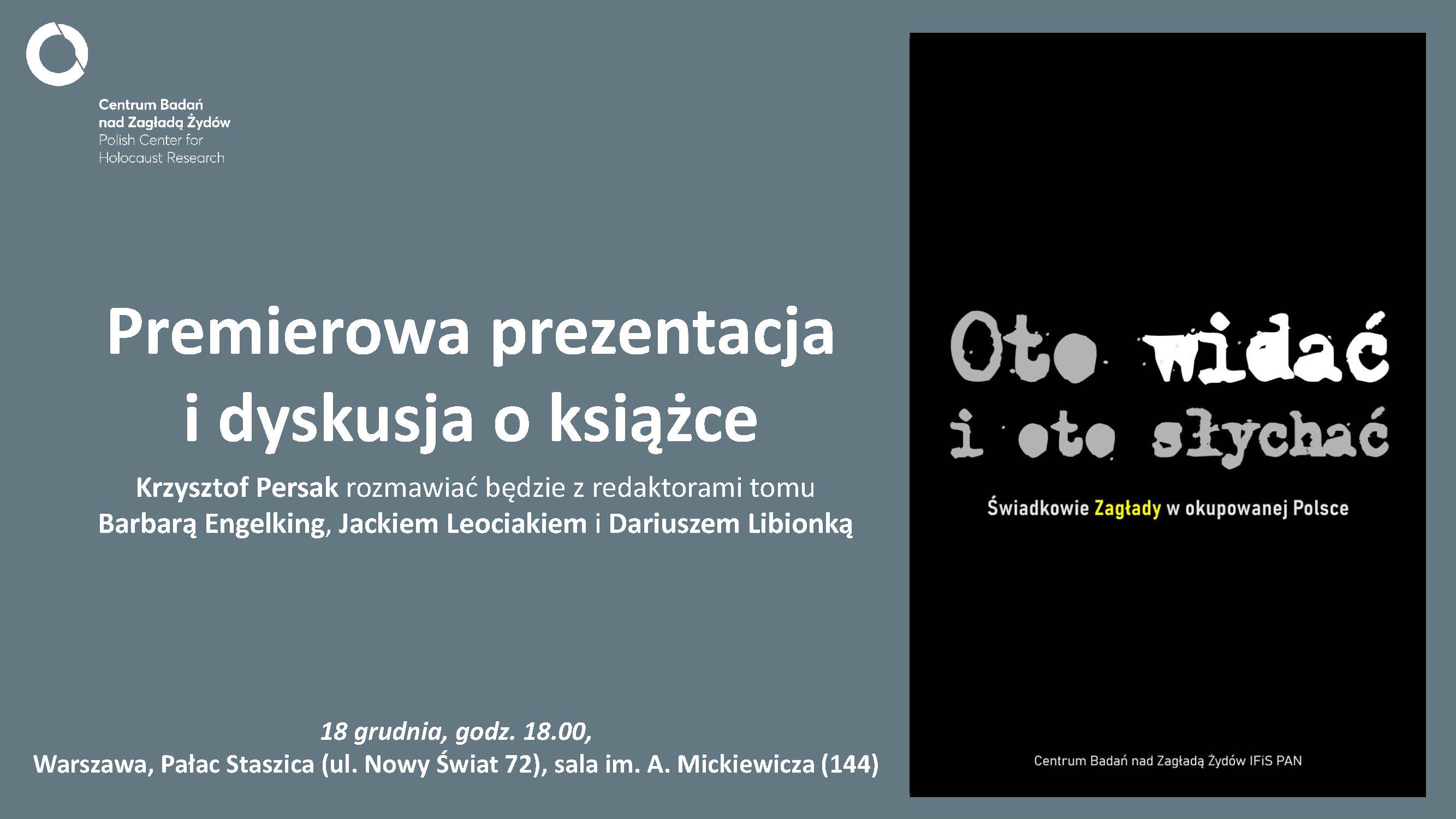 Zapraszamy na premierową prezentację i dyskusję - Oto widać i oto słychać. Świadkowie Zagłady w okupowanej Polsce, najnowszej publikacji Centrum Badań nad Zagładą Żydów IFiS PAN. Krzysztof Persak rozmawiać będzie z redaktorami tomu Barbarą Engelking, Jackiem Leociakiem i Dariuszem Libionką