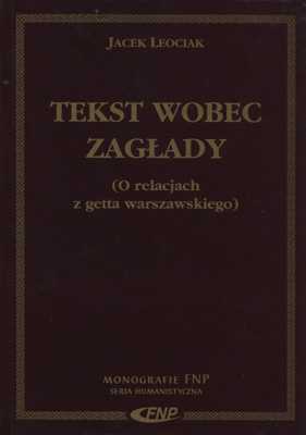 W serii Monografie Fundacji na Rzecz Nauki Polskiej ukazała się kolejna interesująca książka. Jest nią praca literaturoznawcy, historyka i publicysty Jacka Leociaka "Tekst wobec zagłady. (O relacjach z getta warszawskiego)". Autor przeanalizował zachowane dzienniki, pamiętniki, zapisy kronikarskie, sprawozdania i listy pisane podczas okupacji przez Żydów, zarówno tych przebywających w getcie warszawskim, jak i żyjących w ukryciu poza jego murami.