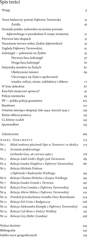 Książka ta opisuje ostatnią fazę zagłady żydowskiej ludności powiatu Dąbrowa Tarnowska. Na podstawie bogatej dokumentacji z archiwów polskich, niemieckich i izraelskich autor odtwarza wydarzenia z lat 1942–1945, kiedy to Niemcy próbowali wyłapać żydowskich niedobitków, tych, którzy latem 1942 r. uniknęli wywiezienia do obozu zagłady w Bełżcu. Książka opisuje z jednej strony działania policji niemieckiej, a z drugiej rolę polskiej policji granatowej, wiejskich straży nocnych, junaków z Baudienst czy też miejscowych strażaków w wykryciu i zamordowaniu żydowskich ofiar. Na tle trwającego aż do końca wojny Judenjagd („polowania na Żydów”) zostały również zarysowane dramatyczne wybory stojące przed ludźmi ratującymi Żydów.