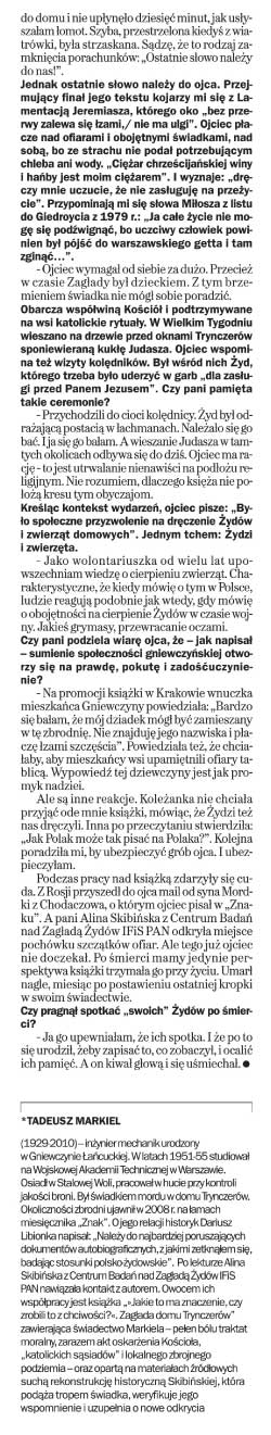 - Mama powiedziała, że ojciec chce zapisać to, co gnębiło go przez całe życie i o czym nigdy z nami nie rozmawiał. I krótko wyjaśniła ... Zaczęłam łączyć fakty. Uświadomiłam sobie , że Żydzi byli zawsze w jego życiu obecni. Miałam siedem lat, chciałam dać mojej przyjaciółce książkę w prezencie. Wręczył mi "Pamiętnik" Dawida Rubinowicza, żydowskiego chłopca spod Bodzentyna, i powiedział: .Podaruj jej, to piękna książka", Kupował bilet na pekaes i nagle mówi do kasjerki: "Takimi autobusami wieźli Żydów...". Po ataku na World Trade Center byliśmy u znajomych. Ktoś powiedział, że ocaleli tylko Żydzi, bo wie dzieli o ataku wcześniej i zdążyli uciec. Ojciec się zdenerwował: "Jest pan katolikiem?". ,,Jestem". "A wie pan, ze Jezus i jego matka, do których pan się modli, to Żydzi?". Ojciec zawsze